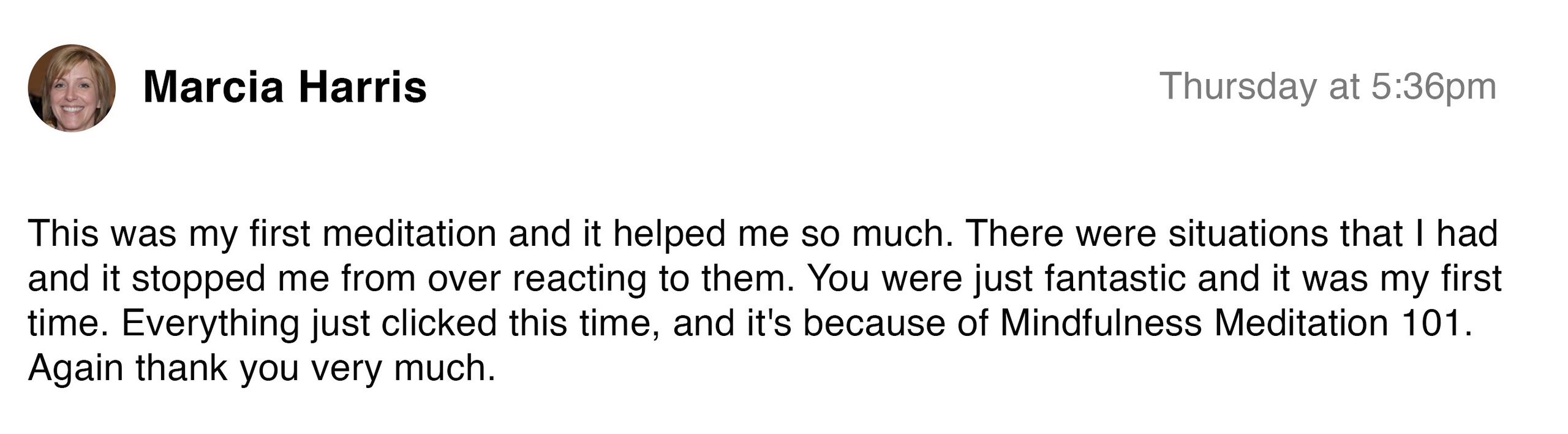 Instant access to the Mindfulness Meditation 101 Private Facebook Group to get your questions answered, and join a like-minded community of aspiring meditators just like you!